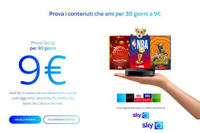 Ora hai la possibilità di provare tutto questo per 30 giorni ad un prezzo simbolico di 9 euro: ricevi a casa il tuo decoder Sky Q, accedi a tutta l’offerta di Sky e, dopo 30 giorni, decidi se tenere tutto o restituirlo senza costi aggiuntivi.