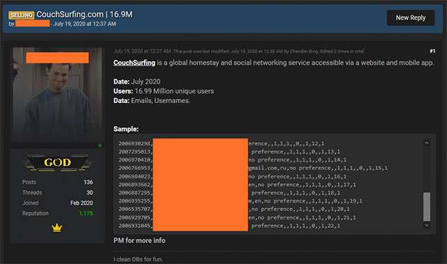 Dai vertici della piattaforma non sono al momento ancora giunte comunicazioni ufficiali in merito, ma ZDNet dà per certa una violazione di CouchSurfing, portale utilizzato dagli utenti di tutto il mondo per trovare un posto in cui alloggiare durante gli spostamenti. Si parla di un database contenente le informazioni personali di 16,9 milioni di utenti messo in vendita per 700 dollari su un forum dedicato all’hacking e attraverso alcuni canali Telegram.