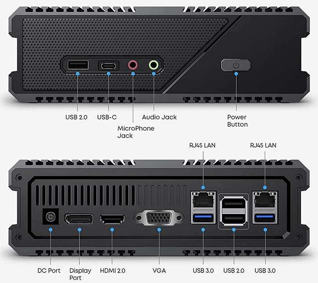 Nell’immagine qui sopra sono visibili le porte di connessione presenti ovvero due slot Ethernet, tre USB Type-A e una Type-C, due jack audio, uscite video HDMI 2.0, DisplayPort e VGA per il collegamento simultaneo a più monitor con supporto alla risoluzione 4K. Altre informazioni sono riportate nella descrizione completa.