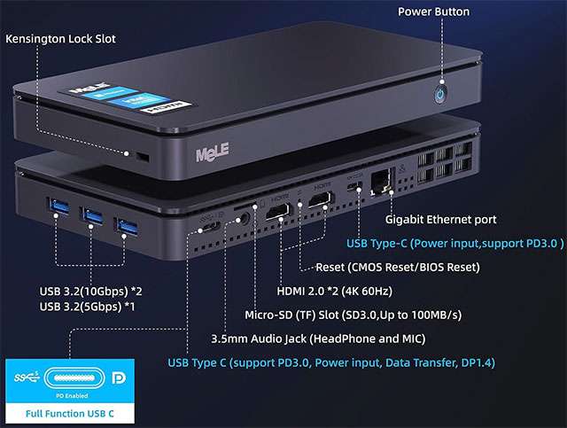 Il sistema operativo preinstallato è Windows 11 Pro con licenza ufficiale Microsoft. Queste, invece, le specifiche tecniche più importanti tra quelle integrate: processore Intel N5095 con GPU Intel UHD Graphics, 8 GB di RAM, 256 GB di memoria interna (espandibile fino a 4 TB), moduli Wi-Fi 6 e Bluetooth 5.2 per la connettività wireless, due uscite video HDMI che, insieme a una USB-C con DisplayPort, possono essere impiegate per connettere fino a tre monitor con supporto alla risoluzione 4K, slot Ethernet, tre USB 3.2 e jack audio. Per saperne di più è possibile consultare le informazioni riportate nella descrizione completa.