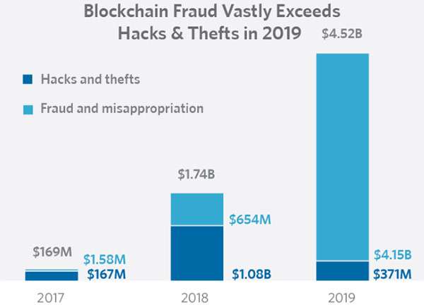 Il riferimento è ovviamente a Bitcoin, ma non solo, anche a Ethereum e alle altre monete virtuali che circolano su blockchain. Nel grafico allegato qui sotto un ulteriore dettaglio: la sezione blu delle colonne è da attribuire ad hack e furti, quella azzurra a frodi e appropriazioni indebite, sempre più frequenti di anno in anno. Queste le parole di Dave Jevans, CEO CipherTrace, affidate alla redazione di Reuters.
