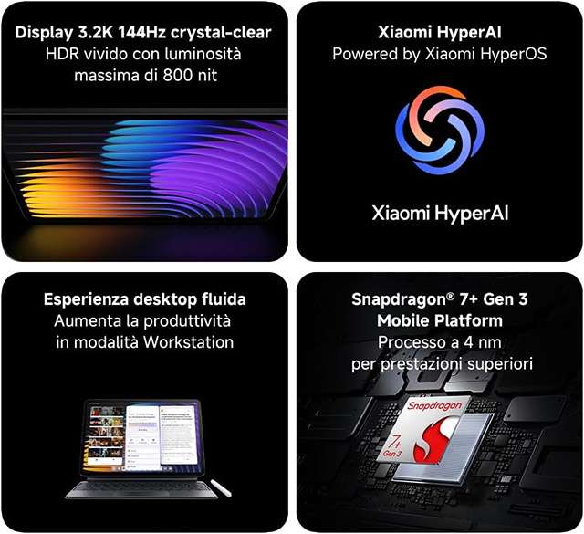 Il cuore pulsante è costituito dal processore Snapdragon 7+ Gen 3 di Qualcomm con GPU Adreno e motore AI, affiancato da 8 GB di RAM e 128 GB di memoria interna. Ci sono poi le fotocamere da 13 e 8 megapixel, la connettività Wi-Fi 6E, Bluetooth 5.4 e quattro altoparlanti. La ciliegina sulla torta è rappresentata dalla batteria da 8.850 mAh con autonomia elevata e supporto alla ricarica Turbo da 45 W. Il sistema operativo è Android con interfaccia personalizzata HyperOS, accesso a Google Play per scaricare le applicazioni e funzionalità di intelligenza artificiale grazie a HyperAI. Scopri di più nella scheda completa.