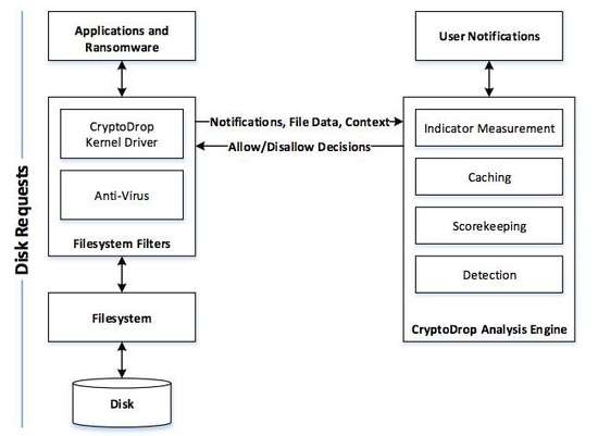 L’architettura di CryptoDrop è composta da un modulo del kernel che filtra in tempo reale letture e scritture sul filesystem nelle cartelle dell’utente Windows e le inoltra al motore di analisi. Il software prenderà la decisione di bloccare o consentire le operazioni di Input/Output dopo aver cercato alcuni marker che, secondo i ricercatori, “non sono mai stati utilizzati finora in un prodotto anti-malware” per identificarne uno basandosi unicamente sul suo comportamento in tempo reale. Oltre alle modifiche in massa, CryptoDrop assegna un punteggio sulla base del grado di similitudine tra input e output, tipicamente basso nei file crittografati; inoltre esegue il monitoraggio dell’ entropia del sistema, che registra un abbassamento in corrispondenza di operazioni crittografiche su file (il cui contenuto ne presenta invece un livello elevato). Oltre a questo si aggiungono altri indicatori secondari che aiutano a raffinare l’identificazione.