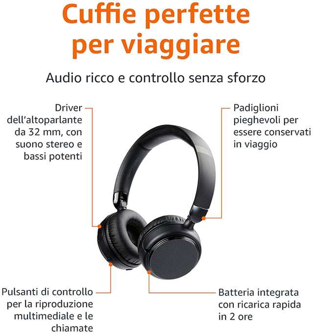 Quella che ti segnaliamo su questa pagina è un’offerta a tempo che potrebbe scadere da un momento all’altro: le cuffie wireless on-ear del marchio Amazon Basics, perfette per viaggiare, sono in forte sconto. Sono state progettate per un ascolto prolungato senza affaticamento, grazie a cuscinetti auricolari morbidi, un archetto imbottito regolabile e il design leggero assicurano. La batteria interna garantisce fino a 35 ore di autonomia con una sola ricarica da effettuare tramite USB-C.