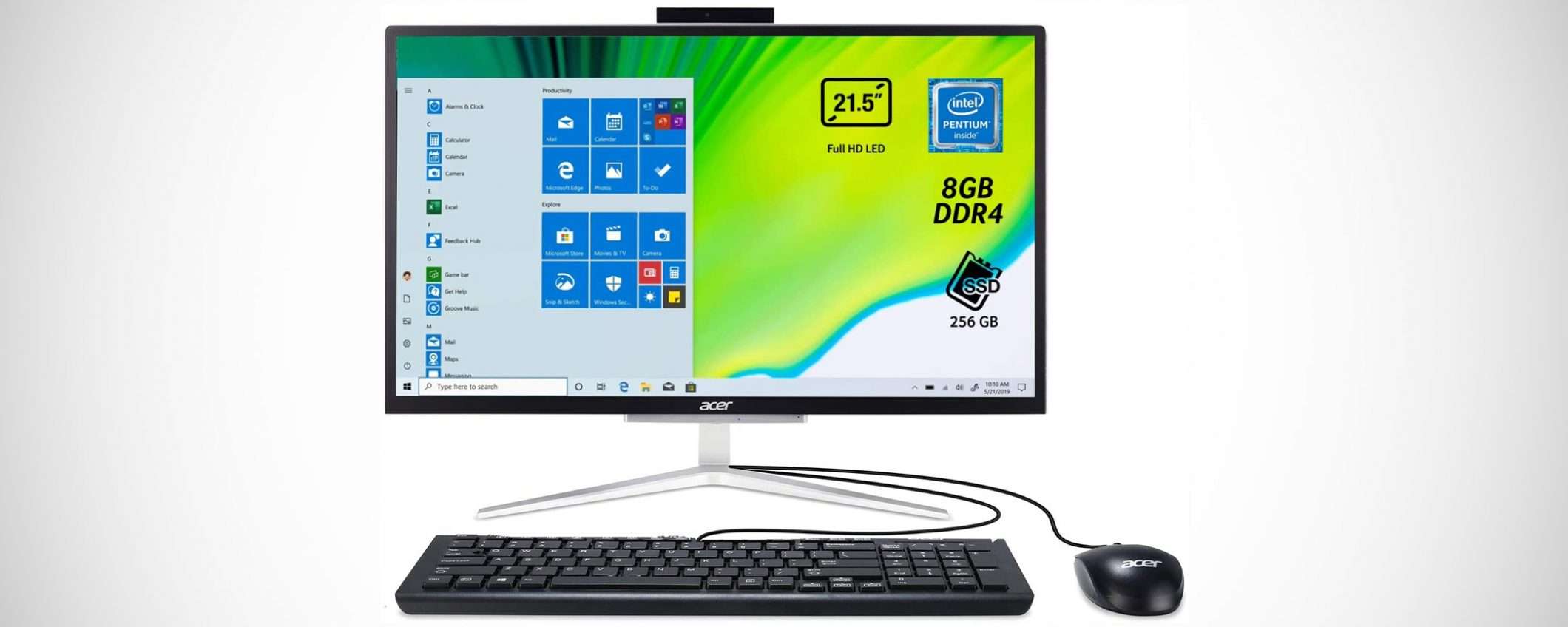 Diamo uno sguardo alla scheda delle specifiche tecniche: display da 21,5 pollici con risoluzione Full HD (1920×1080 pixel), processore quad core Intel Celeron J5040, 8 GB di RAM DDR4, unità SSD da 256 GB per lo storage, moduli WiFi e Bluetooth, slot Ethernet, quattro porte USB (di cui due 3.0), ingresso video HDMI, due jack audio da 3,5 mm e webcam pop-up che compare solo quando serve. Il sistema operativo preinstallato è Windows 10 Home. Mouse e tastiera con cavo sono inclusi.