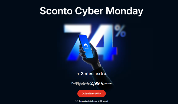 NordVPN cavalca il periodo del Cyber Monday con una promozione dedicata ai nuovi clienti. L’abbonamento, solitamente proposto a 11,59€ al mese, scende a soli 2,99€ con sconto fino al 74% e tre mesi aggiuntivi inclusi nel piano.