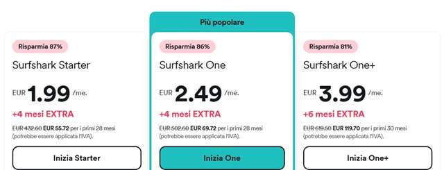 Surfshark sceglie di anticipare la concorrenza presentando subito l’offerta del Black Friday. Protagonisti della promozione i piani VPN di due anni, con sconti fino all’87% e prezzi a partire da 1,99 euro al mese. Inoltre, i nuovi utenti possono beneficiare di 4 mesi extra in regalo, che diventano 6 scegliendo il piano One+ (quello più completo).