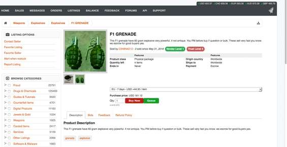 Anche armi ed esplosivi sono molto richiesti nella Darknet. L’immagine mostra una granata in vendita. Prezzo: circa 140 euro