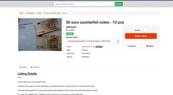 Banconote di Euro o dollari contraffatti vengono offerte in modo massiccio e i prezzi variano in base alla qualità. Per dieci pezzi falsi da 50 Euro, il rivenditore chiede appena 60 Euro. Le banconote includono anche consigli su come smerciarle: “Rifilatele a un servizio di pizza a domicilio”