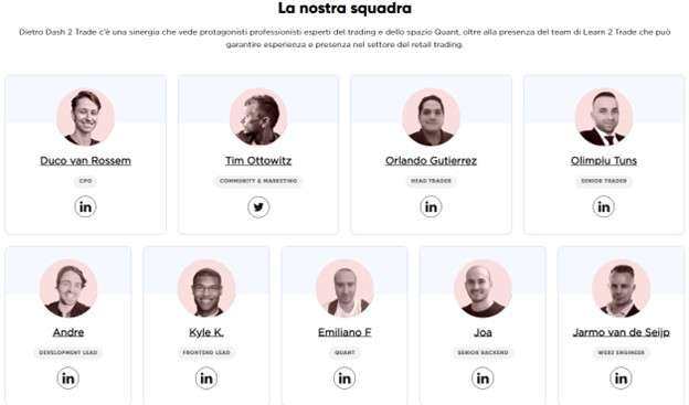 Dash 2 Trade è creato da un team con grande esperienza nel settore: si tratta di professionisti esperti di trading e sviluppatori Quant. È presente, inoltre, la stessa squadra che ha creato un’altra piattaforma di successo, Learn 2 Trade, sempre rivolta ai trader ma più incentrata sui segnali e sulla divulgazione. Attualmente conta oltre 70.000 utenti in tutto il mondo.
