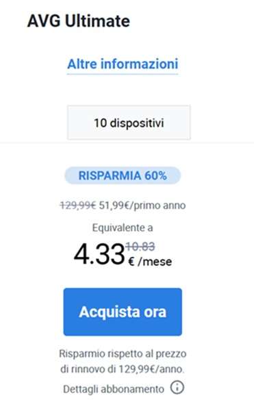 Al momento entrambi i piani per la sicurezza digitale del marchio AVG sono in sconto del 60%, con prezzi a partire da 3,13 euro al mese per un anno. E qualora il servizio non soddisfi le proprie aspettative iniziali, si può sempre richiedere il rimborso completo entro 30 giorni dalla data di acquisto.