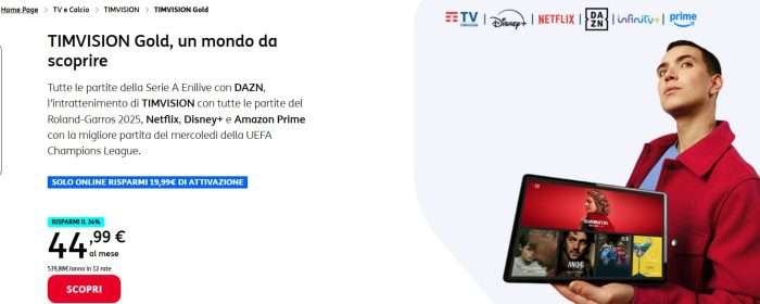 Ma il pacchetto TIMVISION Gold è anche molto altro: nelle prossime righe illustreremo nel dettaglio tutta l’offerta. Però prima vogliamo dirti che è attiva un’eccezionale promozione: puoi averlaa soli 44,99€ al mese. Ma cosa comprende?