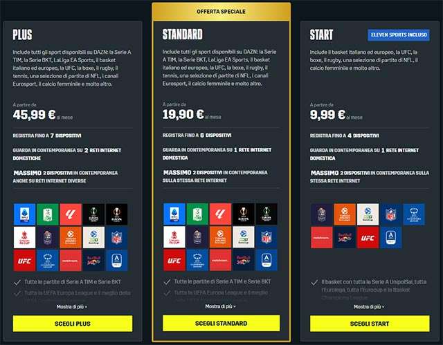 La spesa mensile crolla così a soli 19,90 euro, invece di 40,99 euro come da listino. Include l’intera Serie A, ma c’è di più: fanno parte del catalogo anche Serie B, Europa League, Conference League, LaLiga, il meglio della Liga Portugal, calcio femminile, tennis, basket, boxe, rugby, incontri UFC e sfide selezionate della NFL per gli appassionati di football americano. Si tratta della formula che permette di registrare fino a un massimo di sei dispositivi (smartphone, tablet, computer, televisori, lettori multimediali e così via) e di guardare i contenuti su due in contemporanea, purché connessi alla stessa rete domestica. Per maggiori informazioni e per conoscere ulteriori dettagli sulla promozione visitare la pagina dedicata.