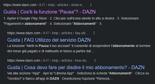 Una semplice ricerca su Google effettuata digitando la query dazn pausa abbonamento
