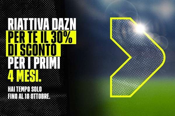 Nuova interessante promozione di DAZN, dopo quella di fine settembre. Stavolta però è riservata esclusivamente ai vecchi abbonati. Solo questi ultimi hanno infatti ricevuto l’email che li invita a riattivare l’account al prezzo di 20,99 euro per quattro mesi. L’offerta è valida fino al 10 ottobre.