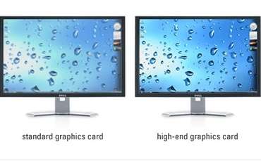 Due schermi a confronto: uno, lievemente sfocato, rappresenterebbe l’immagine riprodotta da una scheda grafica standard, l’altra, perfetta nei contrasti e nei dettagli, il risultato di una scheda grafica di fascia alta. Si tratta di un’immagine (al momento rimossa ) offerta nella sezione “Aiutami a scegliere” del sito Dell dedicato alle schede video.