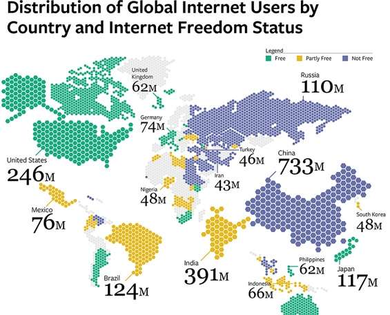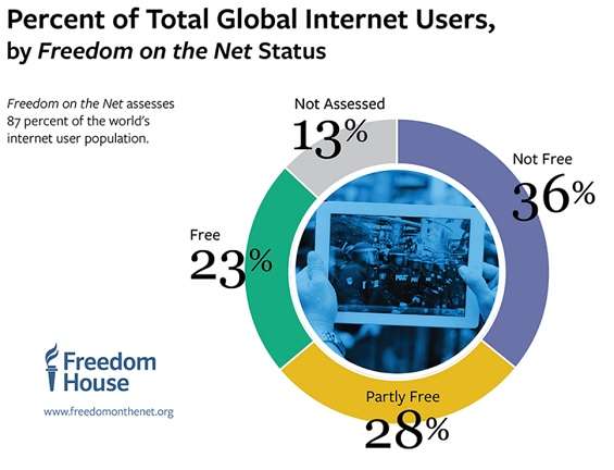 Mai il declino della democrazia su Internet è attaccato sotto molti altri fronti. Alcuni governi hanno infatti minato la libertà bloccando completamente la connessione a Internet in alcune zone del Paese abitate da minoranze etniche, come l’area tibetana in Cina e Oromo in Etiopia, imposto censura e nel peggiore dei casi proibito l’utilizzo della rete (Corea del Nord). Ma vi sono anche casi di disconnessione mirata nel tentativo di impedire la trasmissione di video live : è il caso della Bielorussia ; ufficialmente lo scopo era per impedire la trasmissione di nudo e violenza, anche se sembra che la volontà sia piuttosto quella di frenare i manifestanti e distrarre quindi da temi politici scomodi.
