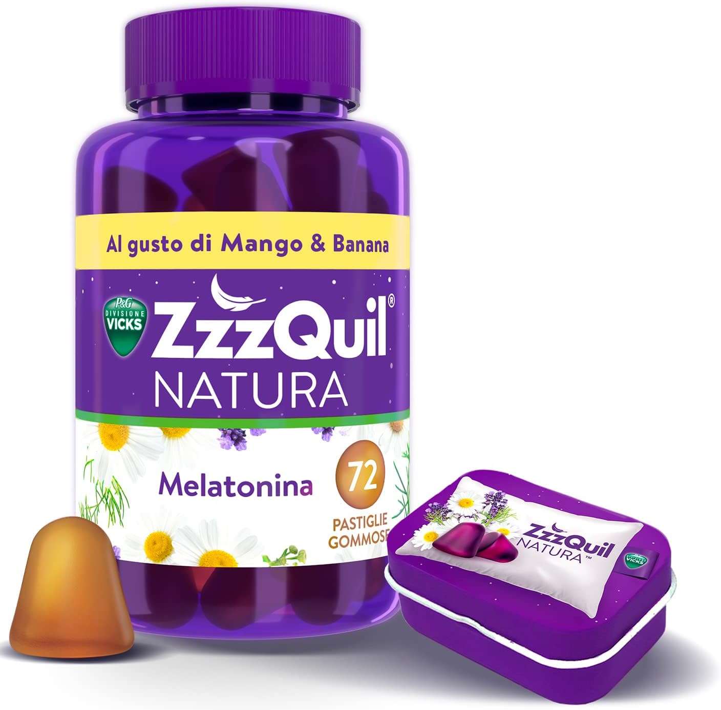 ZzzQuil Natura si presenta come un integratore alimentare contenente melatonina, un ormone naturale che facilita il processo di addormentamento e contribuisce a un risveglio più riposante. Ogni caramella gommosa di ZzzQuil Natura combina 1 mg di melatonina con estratti di valeriana (30 mg), camomilla (10 mg), lavanda (10 mg), e vitamina B6 (1,4 mg). La melatonina regola il ritmo circadiano, cioè il ciclo sonno-veglia. ZzzQuil Natura apporta al corpo la quantità necessaria di melatonina per agevolare in modo naturale il sonno.