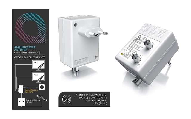 Invece, se hai in casa più apparecchi TV devi assolutamente acquistare l’Amplificatore DVB-T2 Aplic. Con soli 23 euro aumenterai il segnale in arrivo dall’unico cavo dell’antenna per portarlo in modo uniforme e indipendente fino a un massimo di 2 televisori o decoder contemporaneamente. L’installazione è facile e veloce.