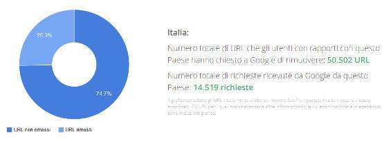 Ad oggi, le richieste formulate a Google da utenti italiani sono 14.519, relative a 50.502 URL: Mountain View ha proceduto alla deindicizzazione nel 74,7 per cento dei casi , e alcuni dei richiedenti insoddisfatti dei suoi dinieghi, come previsto dall’UE, si sono rivolti all’autorità garante per la privacy, che lavora su una serie di linee guida discusse fra pari in sede europea. L’authority italiana riferisce ora di avere ricevuto “alcune decine” di segnalazioni, nove casi sono già stati esaminati.