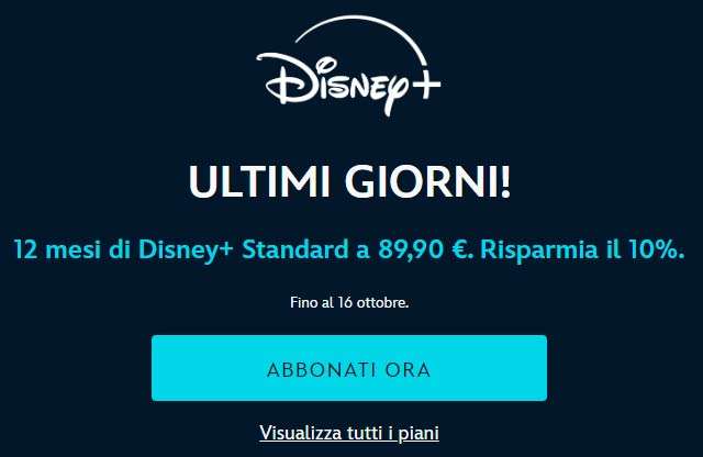 Ti rimangono dunque poche ore per evitare l’aumento del listino e bloccare il prezzo dell’abbonamento annuale Standard a Disney+ a 89,90 euro, invece di 99,90 euro come sarà dopo il rincaro.