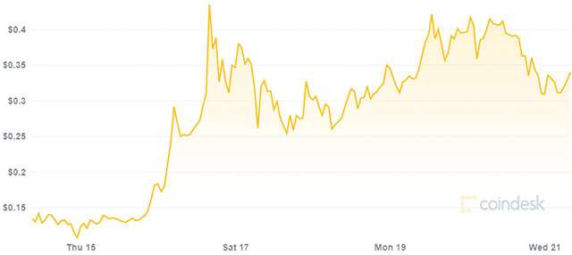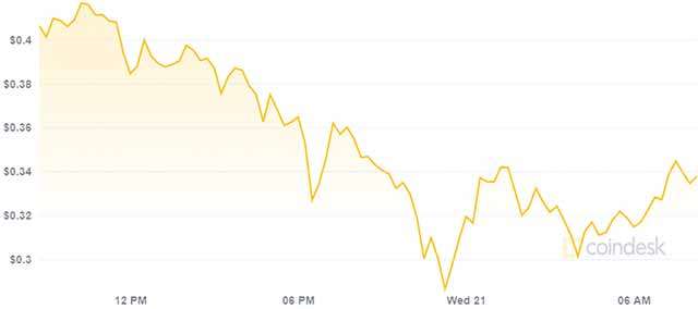 Il record storico è quello toccato nella giornata di sabato, a 0,45 dollari. Il grafico qui sotto mostra la flessione apprezzata tra ieri e oggi, con la quale si trova ora a dover fare i conti chi ha scelto di acquistare la moneta virtuale.