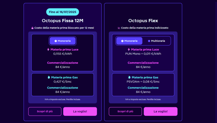 Tutti i valori restano invariati per un anno: ciò consente maggiore controllo sulle spese domestiche e protezione contro eventuali rincari energetici. Se invece preferisci una promozione legata all’andamento del mercato, è disponibile anche la soluzione Octopus Flex, che applica tariffe indicizzate (PUN per la luce, PSV per il gas).
