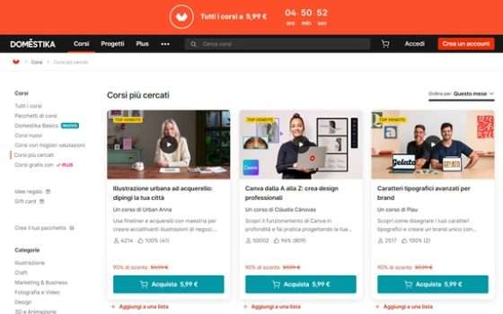 Approfitta di questa promozione Domestika che sconta i corsi fino al 90% e ti consente di imparare spendendo solamente 5,99 euro. Non a caso, le tue conoscenze miglioreranno in breve tempo perché avrai l’opportunità di interagire con i migliori professionisti e scoprire tutti i segreti del settore a cui sei interessato.