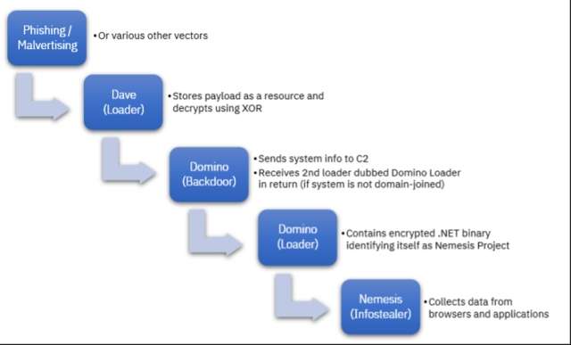 Quest’ultimo scarica dal server remoto un info-stealer scritto in linguaggio .NET, denominato Project Nemesis. La catena di infezione inizia con email di phishing, malvertising o altre tecniche, come si può vedere nell’immagine.