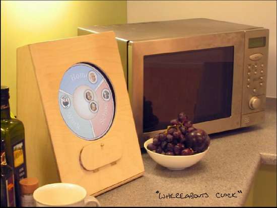RB: Collaboriamo con una ventina di famiglie di Cambridge. I loro feedback e le abitudini di consumo vengono registrati per capire gli usi più comuni dei vari prodotti. È il caso del Whereabouts Clock (vedi in fondo), che ha subito varie modifiche, fino a renderlo utile per le esigenze dei consumatori. In sostanza è un visualizzatore grafico, che consente di conoscere dove si trovano gli altri membri della famiglia. Uno strumento utile per chi rientra per primo in casa, ma al tempo stesso rispettoso della privacy altrui, visto che contiene tre sole voci, casa, ufficio e strada, senza fornire il punto esatto in cui ci si trova.