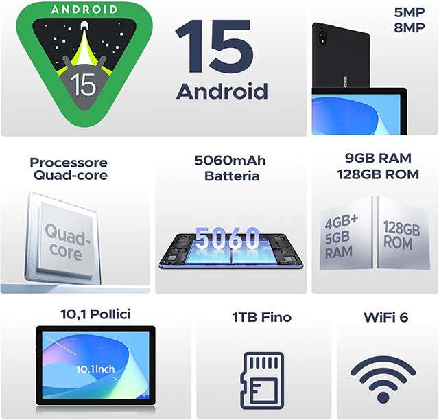 L’intera esperienza ruota attorno al display da 10 pollici in alta risoluzione (1280×800 pixel). Sotto la scocca sono invece presenti un processore quad core affiancato da 9 GB di RAM (4+5 GB virtuali) e da 128 GB di memoria interna (espandibile con microSD fino a 1 TB). A questo si aggiungono la connettività Wi-Fi 6 e Bluetooth 5.0, la fotocamera posteriore da 8 megapixel con flash LED e quella frontale da 5 megapixel, gli altoparlanti, il jack audio per le cuffie e la batteria da 5.060 mAh con autonomia elevata. Il sistema operativo è Android, aggiornato all’ultima versione disponibile, con l’accesso a Google Play per scaricare applicazioni e giochi. Scopri di più in merito alle specifiche tecniche integrate e alle caratteristiche in dotazione nella descrizione completa.