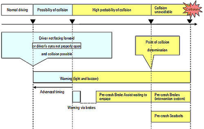 Per dare concretezza al proposito, dunque, Toyota è partita dal sistema già presente sulla Lexus LS600H . Esso prevede, in presenza di ostacoli in avvicinamento, l’emissione di un tono di allarme e, in assenza di reazioni, la chiusura dell’alimentazione al propulsore e l’azionamento autonomo – con ABS, neanche a dirlo – dell’impianto frenante.