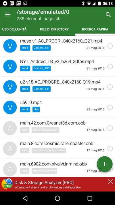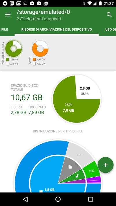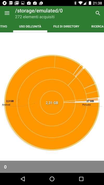 Le informazioni vengono visualizzate attraverso un grafico a torta con i vari settori che hanno una dimensione proporzionale allo spazio occupato. Toccando il pulsante + si può aggiungere una nuova unità all’analisi o un collegamento veloce a una cartella, mentre con uno swipe da destra verso sinistra si passa alla scheda Uso dell’unità : basta un tocco per andare in profondità nelle cartelle.