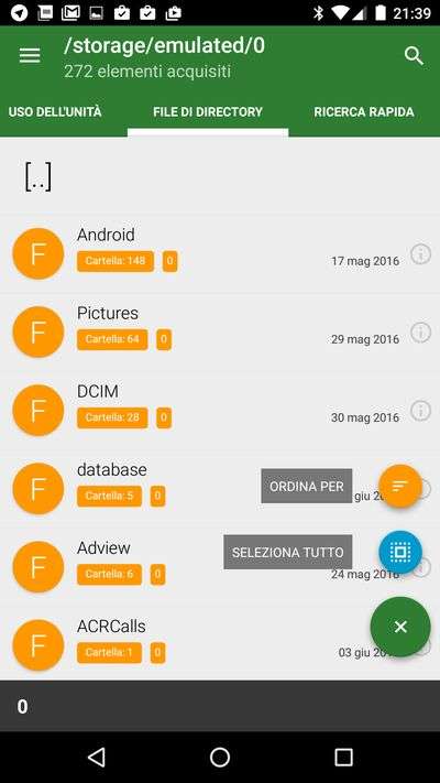 Con un altro swipe si passa alla scheda File di directory da dove è possibile visualizzare in modalità elenco le varie cartelle. Toccando il tasto + è possibile modificare il modo in cui sono ordinati i file per dimensione (impostato di default), nome o ultima modifica.