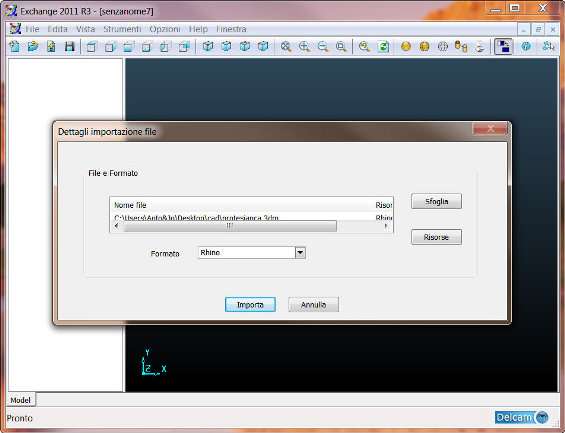 Per aprire qualsiasi file CAD fra quelli supportati è sufficiente cliccare su File/Apri , premere su Sfoglia e selezionare il file di interesse. Automaticamente, Delcam Exchange assocerà il formato al file e caricherà le librerie per consentirne la visualizzazione.
