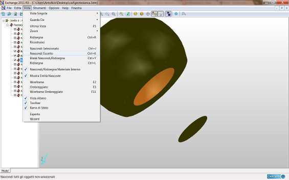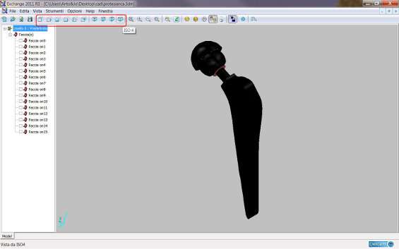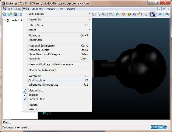 Il file sarà quindi visibile in Delcam Exchange in modalità wired ed accanto al disegno si aprirà un menù ad albero che indica i livelli e le facce di cui è composto il progetto. Per visualizzare l’oggetto in modalità ombreggiata, cliccare sull’icona della prima sfera subito dopo il simbolo dell’aggiornamento, o premere F3 o cliccare su Vista/Ombreggiato .