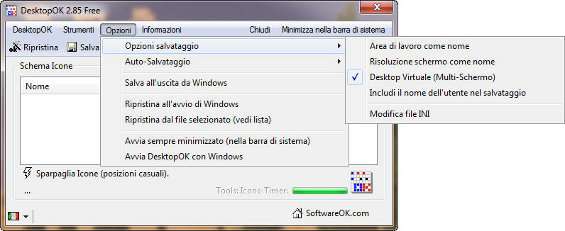 Cliccando su Opzioni/Opzioni salvataggio è possibile decidere quale area del desktop salvare. In generale, poi, sempre dal menù Opzioni è possibile impostare l’autosave, il salvataggio automatico all’uscita di Windows, il ripristino dell’ordine desiderato all’avvio del sistema e lo startup con l’OS, anche minimizzato nel systray.