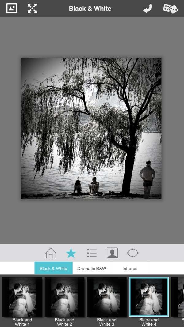 Ovviamente si può anche zoomare per analizzare i dettagli dell’immagine in lavorazione, e in qualsiasi momento è possibile fare un confronto con la foto di partenza, così da comprendere se stiamo realizzando qualcosa di buono o meno. Se non siete troppo avvezzi a lavorare sui parametri di modifica, e i preset già presenti non vi soddisfano (tra parentesi, ce ne sono anche alcuni che simulano l’infrarosso) potete anche affidarvi al caso toccando l’iconcina dei dadi finché non ottenete un risultato piacevole.