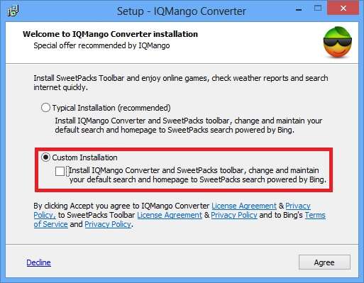 Un clic su Next , e subito bisogna stare attenti ad una piccola insidia, che, se sottovalutata, rischia di portare nel PC un software non gradito. Per questo, nella seconda schermata del wizard, bisogna cliccare su Custom Installation e deselezionare l’opzione disponibile. Cliccare quindi su Agree .