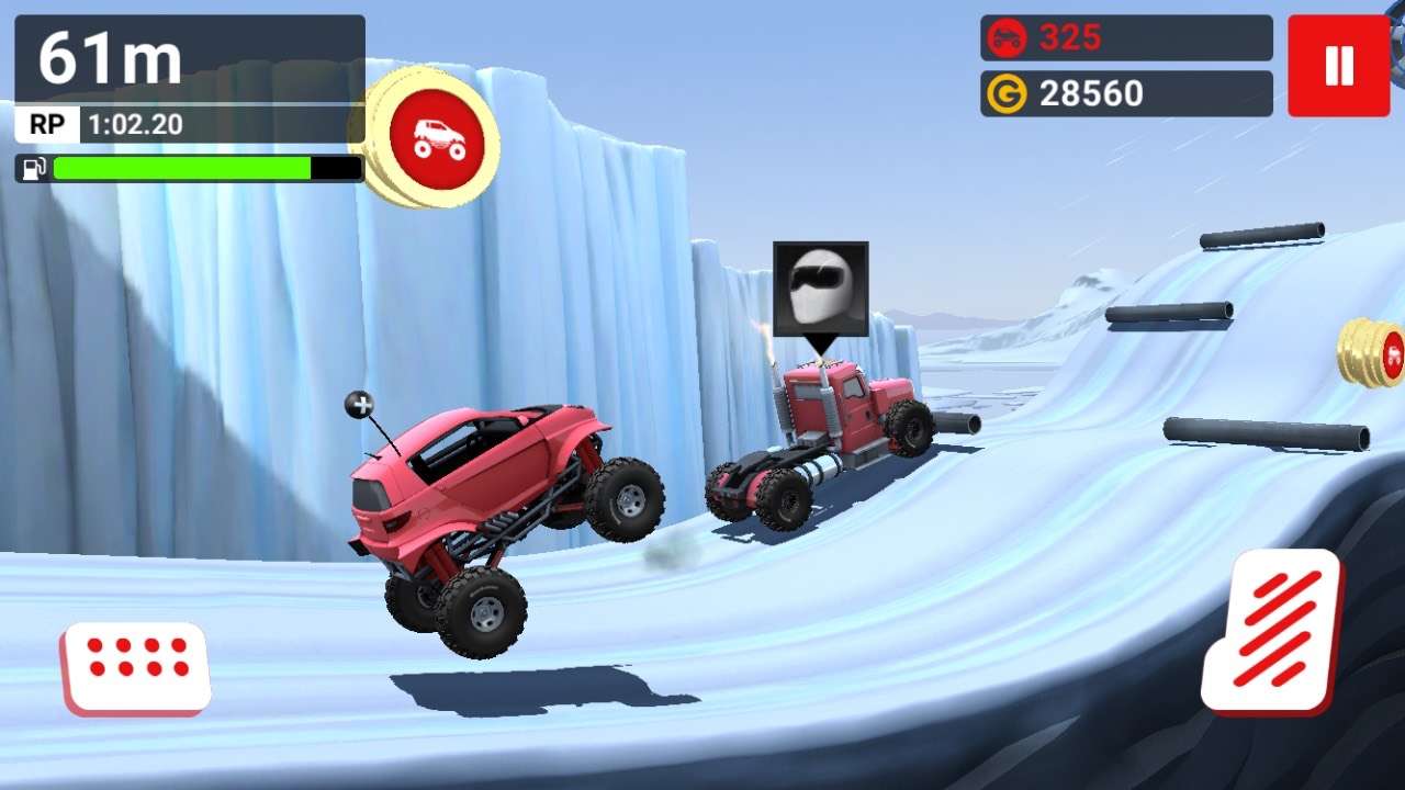 Dicevamo che si tratta di un gioco semplice ma ben fatto, ed ora andiamo ad esaminare questi due aspetti. Il gioco è semplice in quanto prevede l’utilizzo di due soli comandi, acceleratore e freno, che dovremo gestire nel migliore dei modi per percorrere vari scenari scalando colline, superando ostacoli, attraversando ponti, raccogliendo monete per potenziare la nostra auto, e gareggiando contro avversari virtuali per conquistare punteggi migliori ed ulteriori monete. È necessario un perfetto dosaggio di acceleratore e freno, per affrontare salti ed ostacoli nel migliore dei modi e atterrare sempre nella giusta posizione, altrimenti il nostro veicolo esploderà in un modo molto appariscente.