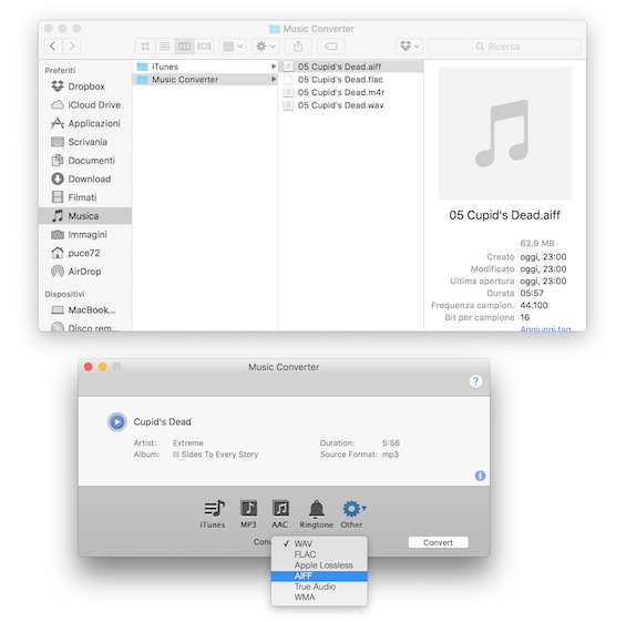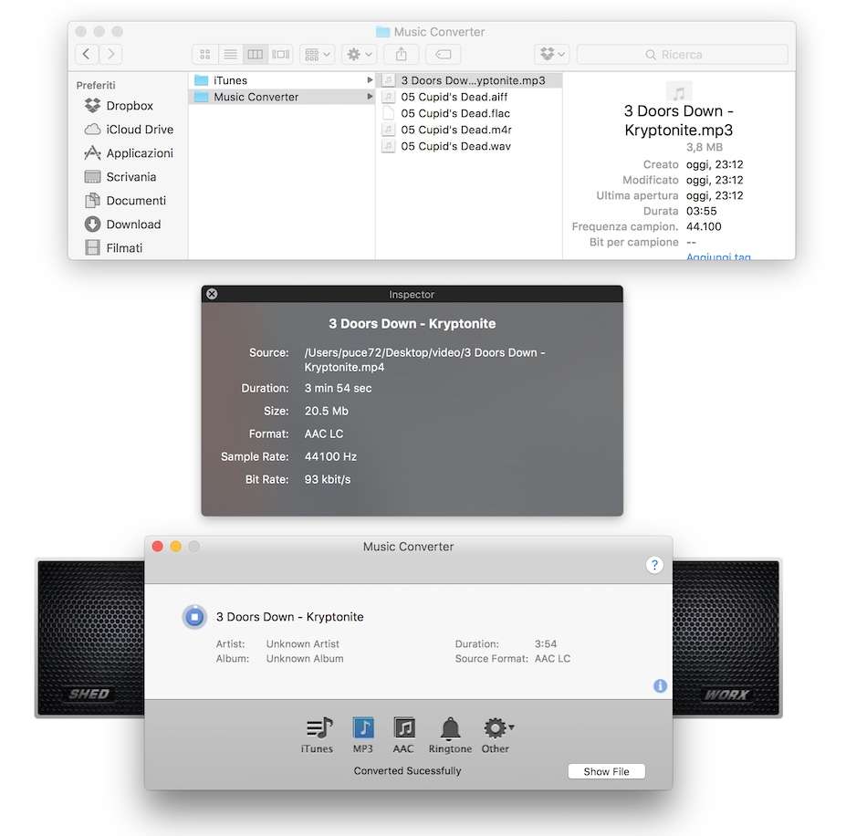 Music Converter di ShadWorx (disponibile per OS X 10.7 o successivi, a 64 bit) è un’applicazione semplice, immediata e leggera, che permette di fare proprio questo: aprire un file musicale in un determinato formato ed esportarlo in un altro.