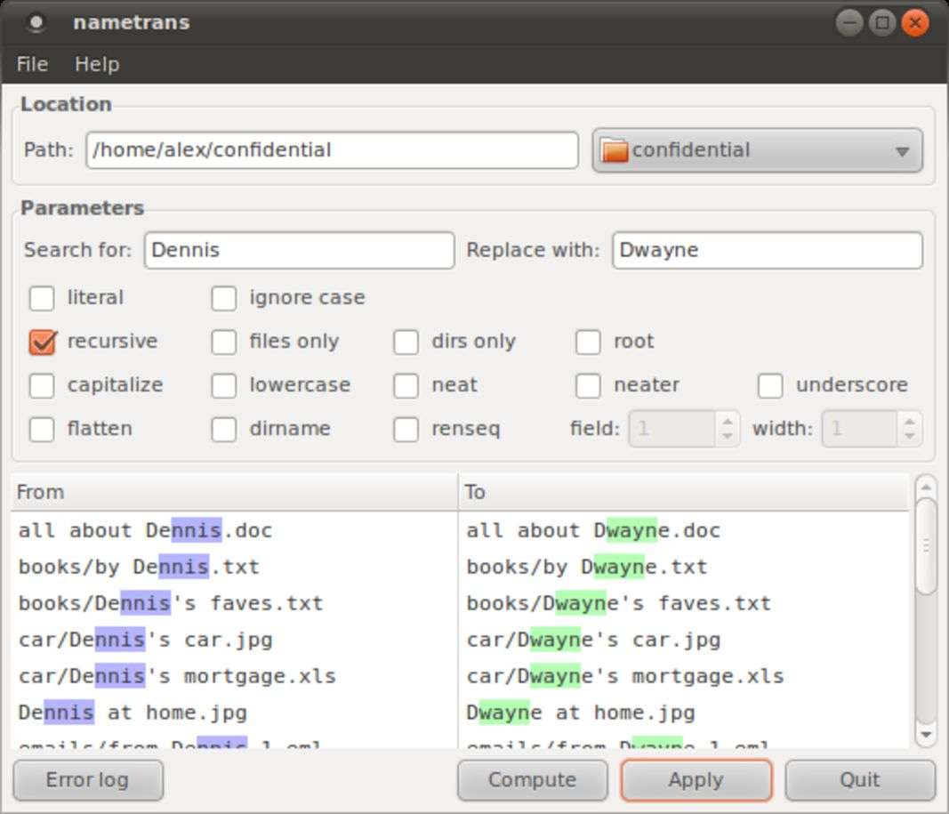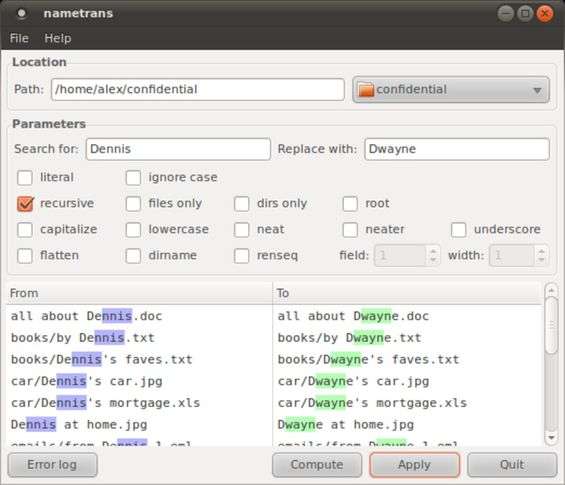Le informazioni fondamentali, ovviamente, sono la stringa da cercare e quella da sostituire. Volendo, si possono anche usare le espressioni regolari, per poter rinominare in modo più intelligente i file. Nametrans ha anche una interfaccia a riga di comando, utile per automatizzare la sostituzione dei nomi in base a qualche script.