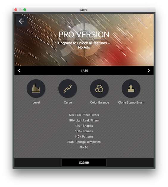 La versione “Pro”, al costo di 29,99 euro, offre molti filtri, cornici, stickers, ed effetti, oltre a maggiori possibilità di regolazione tramite bilanciamento del colore, curve, e timbro clone; gli sticker sono acquisibili anche singolarmente a pacchetti tematici dal costo di 99 centesimi.