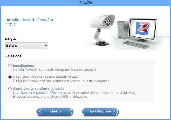 Nella schermata che compare selezionare, in Lingua , la voce Italiano , scegliere se effettuare o meno l’installazione (ad esempio selezionando Eseguire PrivaZer senza installazione ) e premere su Installazione . Da qui è anche possibile generare la versione portable da memorizzare su una qualsiasi chiavetta USB.