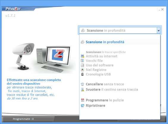 Nella schermata che appare è possibile selezionare una Scansione in profondità (opzione consigliata per un primo utilizzo), oppure scansionare e cancellare tracce specifiche, relative alle attività su Internet, ai vecchi file, all’uso degli applicativi, al registro, alla cronologia delle periferiche USB collegate e ai file eliminati di cui si vuole rimuovere ogni residuo. Da qui è anche possibile programmare le operazioni di pulizia, ma in questo caso il programma deve essere installato sul PC.
