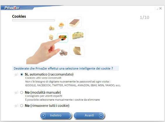 Nella prima schermata viene chiesto se effettuare una scelta automatica o meno dei cookie da eliminare. Con Sì, automatico si eliminano i cookie inutili, lasciando intatti quelli più importanti come quelli di Google, Facebook e via discorrendo. Con No (modalità manuale) si potrà scegliere quali cookie eliminare, mentre con l’ultimo No si chiede al programma di rimuovere tutti i cookie in modo indistinto.