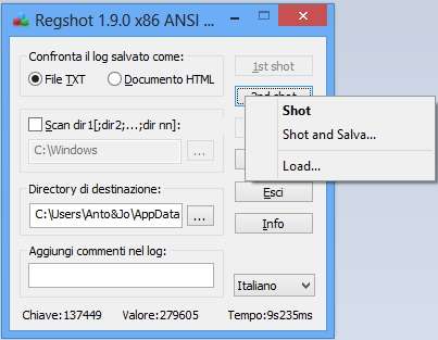A questo punto, un clic su 1st shot/Shot consente di fotografare lo stato del registro e salvarne le chiavi in formato TXT o HTML, a seconda che si sia selezionato File TXT o Documento HTML dalla sezione Confronta il log salvato come .