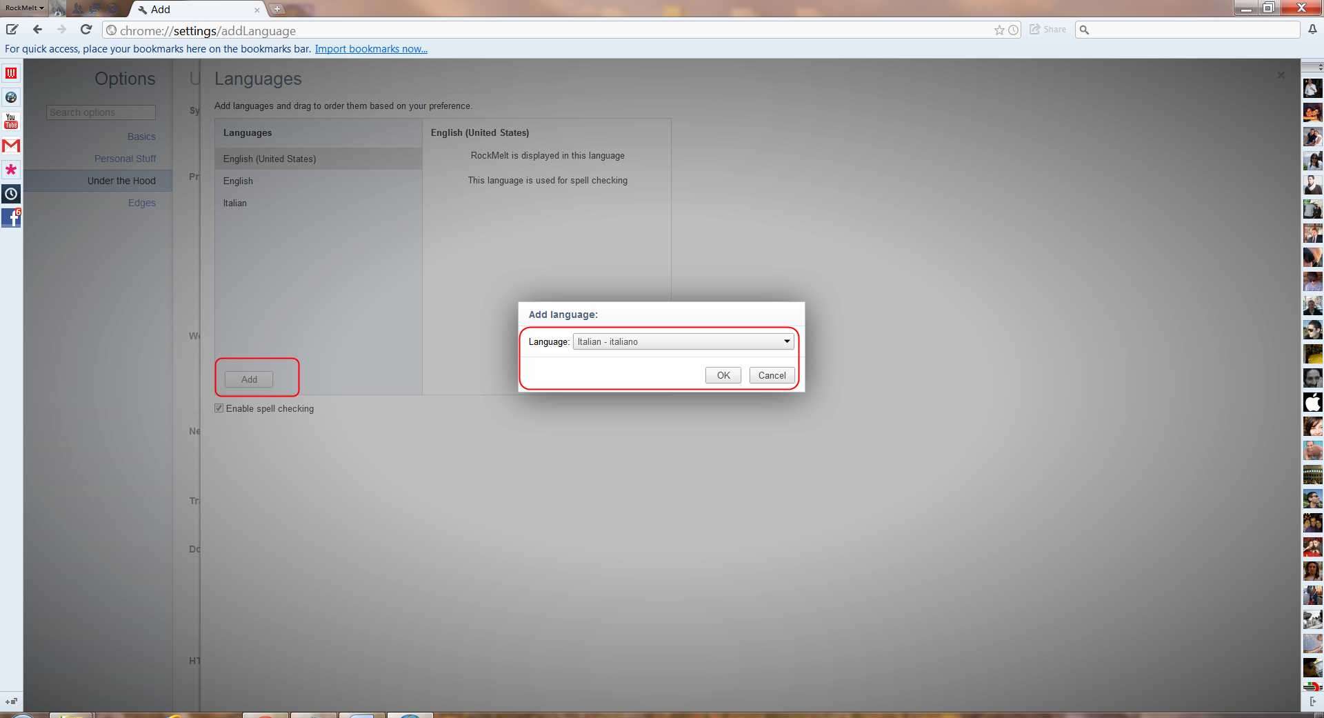 RockMeIt parte di default in inglese ma renderlo comprensibile anche nella nostra lingua è un gioco da ragazzi. È sufficiente cliccare sul menù RockMeIt in alto accanto alla foto del proprio profilo, cliccare su Options , poi su Under the Hood e infine sul pulsante Languages and spell-checker settings presente nella sezione Web Content .