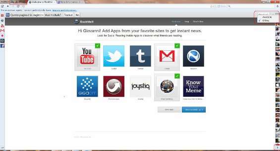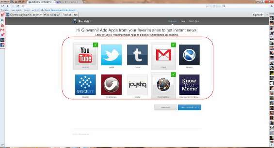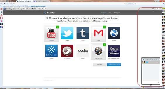 Oltre a Facebook, l’integrazione di RockMeIt avviene attraverso appositi widget che si posizionano sulla colonna di sinistra del browser. Dalla pagina di benvenuto c’è la possibilità di installare YouTube, l’app per la gestione di GMail, i cinguettii di Twitter e tanto altro ancora, semplicemente con un clic. Ad esempio, si può installare la versione internazionale di Wired oppure della CNN e di volta in volta verranno mostrati sull’icona del widget quanti contenuti nuovi vi sono da leggere.