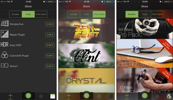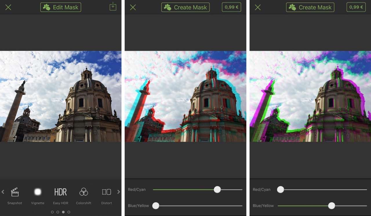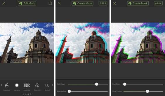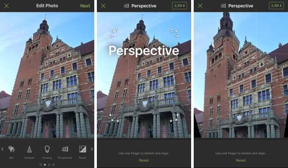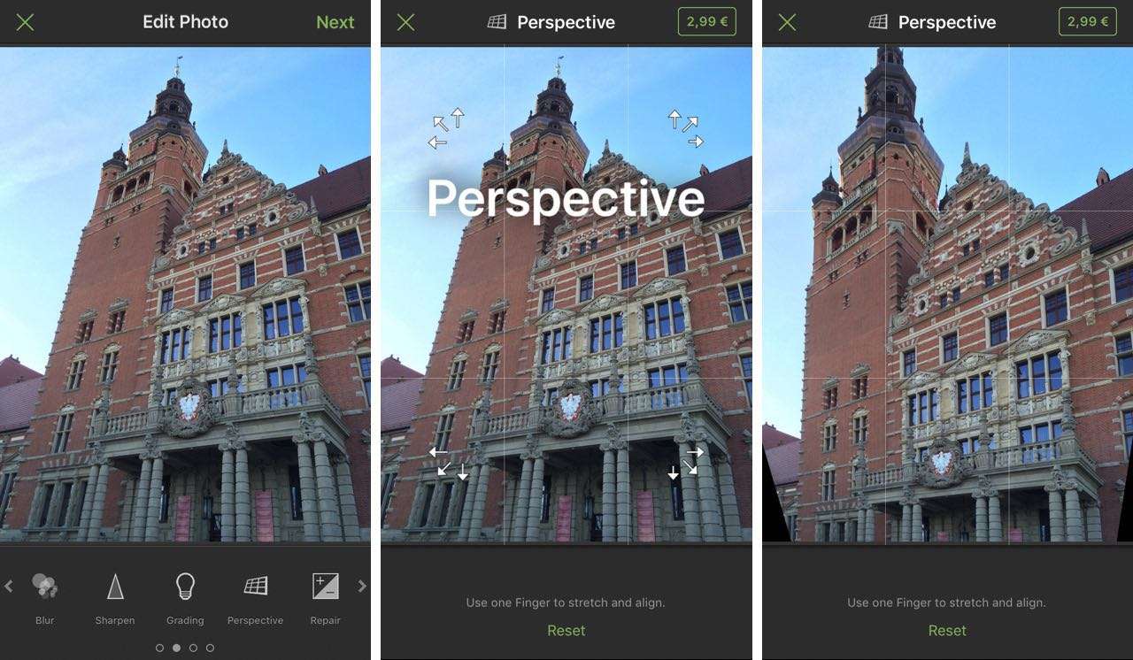 La seconda caratteristica interessante di TADAA è la possibilità di correggere la prospettiva degli scatti, opzione molto utile in certe circostanze, quando non ci sono troppe possibilità di scelta per la posizione da cui si scatta e occorre fare i conti con i limiti di un obiettivo dalle dimensioni ridotte; questo strumento fa però parte di quelli a pagamento, così come la distorsione e il color-shift e la simulazione di un HDR. Gli strumenti a pagamento si possono acquistare singolarmente o in un pacchetto che può anche includere un certo numero di filtri.